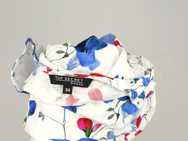 Lekka bluzka damska marki Top Secret Woman, wykonana w 100% z wiskozy. Charakteryzuje się krótkim rękawem, białym kolorem z czarnymi kropkami oraz ozdobnymi falbanami wokół dekoltu i wzdłuż zapięci...