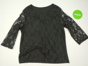 Czarna bluzka z koronką - Fason: prosta bluzka z okrągłym dekoltem - Rękawy: krótkie, szerokie, w całości z ażurowej koronki - Przód: koronkowa warstwa z delikatnym, falującym wzorem; dolna krawęd...