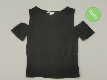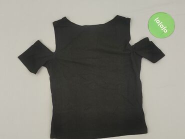 Czarna bluzka z odkrytymi ramionami (cold shoulder) - krój dopasowany, długość do bioder - krótkie rękawy z wycięciami na ramionach - dekolt okrągły z delikatnym wcięciem w kształcie litery V z prz...