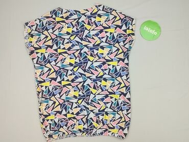 Bluzka damska z krótkim rękawem, luźny krój oversize. Okrągły dekolt, lekko zaokrąglony dół (tył minimalnie dłuższy). Tkanina cienka i przewiewna. Wzór: geometryczna mozaika w romby/kwadraty w kol...Stan: