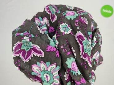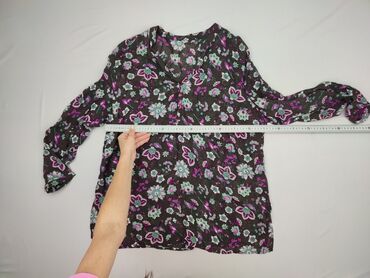 Bluzka damska z długim rękawem, ozdobiona kwiatowym wzorem w odcieniach szarości, granatu i fioletu. Dekolt okrągły, rękawy luźne, zakończone mankietami z drobnymi guzikami. Materiał miękki i przyj...Stan: