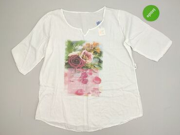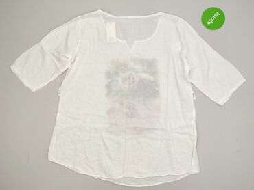 Bluzka damska z kwiatowym nadrukiem - Krój: luźny, z krótkim rękawem typu kimono, okrągły dekolt - Kolor: biały z obfitym nadrukiem róż w odcieniach różu i zieleni na przodzie; tył gładki biały - ...
