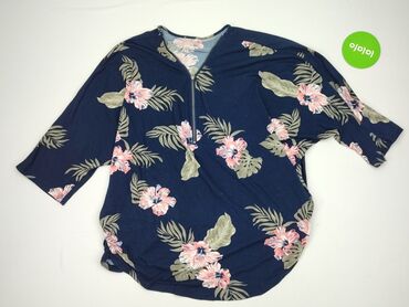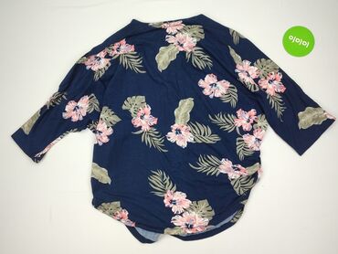 Bluzka damska z kwiatowym nadrukiem - Kolorystyka: granatowa baza z gęstym wzorem kwiatów w odcieniach bieli, różu i błękitu - Krój: luźniejszy, prosty; rękaw 3/4 - Dekolt: okrągły z szeroką, kont...