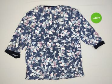 Bluzka damska Madeir, rozmiar 38. - Kolor dominujący: granatowy. - Wzór: duże kwiaty w odcieniach czerwieni i bieli, szare liście. - Fason: prosta linia, dekolt okrągły z ozdobnymi zakładkami/falba...