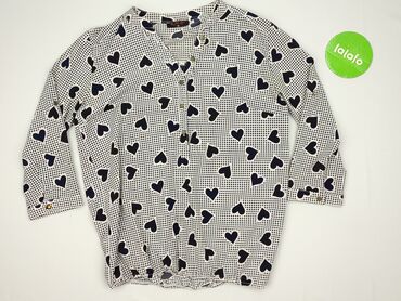 Biała damska bluzka w granatowe serduszka - Rozmiar: 44 (metka widoczna na zdjęciu) - Krój: luźniejszy, lekko zaokrąglony dół z wydłużonym tyłem - Rękaw: długi - Dekolt: w serek bez kołnierza, zapi...