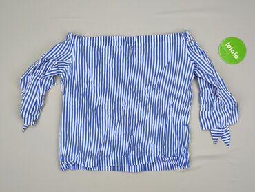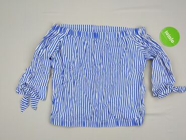 Bluzka damska w paski - Krój: dopasowany, z marszczeniem na środku przy dekolcie - Dekolt: w kształcie litery V - Rękaw: krótki - Wzór: poziome paski biało‑niebieskie - Rozmiar z metki: L - Skład ...