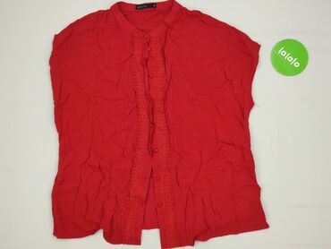 Czerwona bluzka damska MOHITO, rozmiar 38. - Fason: luźny, z krótkim rękawem typu kimono - Dekolt: okrągły - Zapięcie: pełny rząd guzików z przodu - Ozdoby: pionowe wstawki koronkowe/haftowane po ...