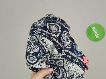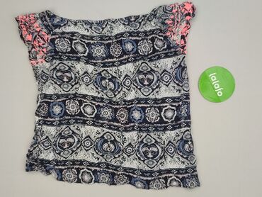 Bluzka damska z krótkim rękawem, rozmiar 36. - Wzór: geometryczno-ornamentalny, mozaika w odcieniach błękitu, granatu, szarości, bieli i żółci. - Dekolt: okrągły z ozdobnym wiązaniem/sznureczkiem...