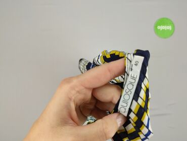 - Wzór: geometryczne pasy/kratka w kolorach granatowym, białym, musztardowym, niebieskim i szarym