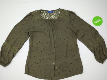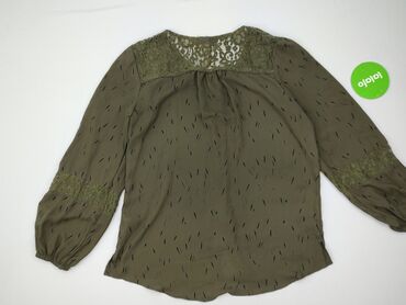Bluzka damska, kolor oliwkowy/khaki, rozmiar XL. - Fason: luźna bluzka z długim rękawem - Dekolt: w serek z krótką listwą guzikową (3 guziki z przodu) - Przód: ozdobny, ażurowy panel z koronki o r...