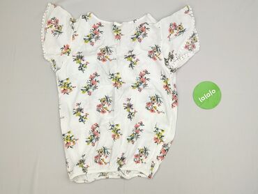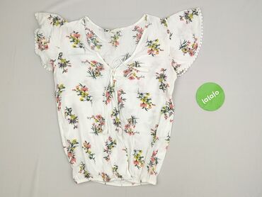 Biała, lekka bluzka damska z krótkim rękawem i koronką - Krój: luźny, lekko skrócony (crop), okrągły dekolt - Rękawy: krótkie, zakończone dekoracyjną koronką w kwiatowy wzór - Dół: koronkowa lamów...Stan: