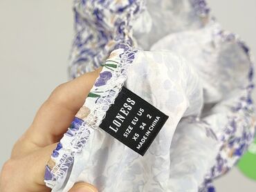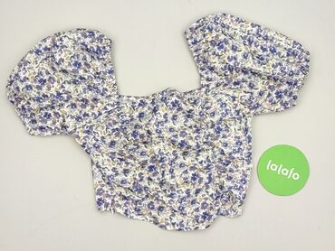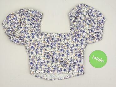 Bluzka damska Diverse, rozmiar XS. - Kolor: biel w drobny, kwiatowy nadruk w odcieniach różu, lilii i fioletu - Krój: luźniejszy, z delikatnie opuszczoną linią ramion - Dekolt: w kształcie litery ...