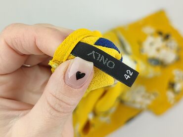 Bluzka damska ONLY - Rozmiar: 42 (na metce) - Kolor: intensywny żółty - Wzór: kwiatowy – białe i niebieskie kwiaty z granatowymi akcentami - Krój: luźniejszy, zaokrąglony dół z przodu i z tyłu, kr...
