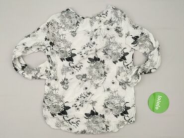 Bluzka damska z długim rękawem, rozmiar 40. - Kolor: biały z szaro‑czarnym, kwiatowym nadrukiem. - Krój: lekko wydłużony tył/zaokrąglony dół, dekolt w serek z listwą i guzikami, kieszonka na pier...
