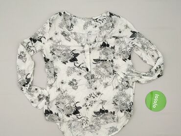 Bluzka damska z długim rękawem, rozmiar 38. - Kolor: biały z czarno‑szarym, kwiatowym nadrukiem na całej powierzchni - Krój: lekko luźny, zaokrąglony dół, tył nieco dłuższy - Dekolt: w serek z krót...