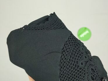 Czarna koronkowa bluzka damska z krótkim rękawem - Fason: dopasowany, długość do bioder - Dekolt: okrągły z małym rozcięciem w kształcie łezki przy karku, zapinanym na guzik - Przód i rękawy: ażur...