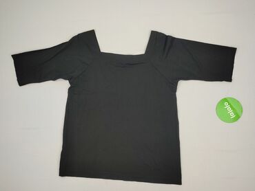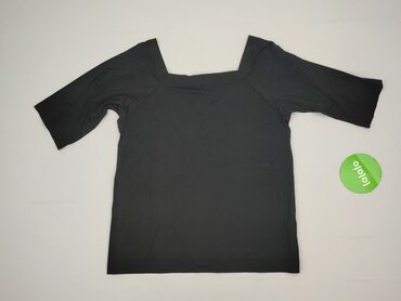 Czarna bluzka damska z dzianiny - Krój: prosty, lekko dopasowany - Dekolt: łódkowy - Rękaw: 3/4 - Dół: asymetryczny z wiązaniem/wiązany pasek po boku - Materiał: miękka, elastyczna dzianina (przyj...