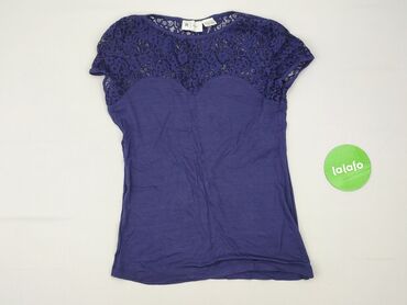 Granatowa bluzka damska Moda&Line - Krój: dopasowany, z krótkim rękawem - Dekolt: okrągły - Ozdoby: koronkowa wstawka na karczku (przód i tył), rząd srebrnych nitów/ćwieków z przodu, dekoracyjny p...