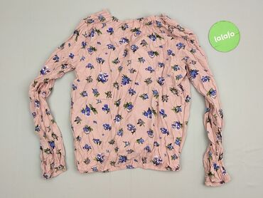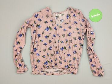 Bluzka damska marki Sinsay w rozmiarze S. Charakteryzuje się wzorem w tropikalne kwiaty i liście na jasnoróżowym tle. Posiada długie rękawy oraz dekolt w kształcie litery V, co nadaje jej swobodneg...