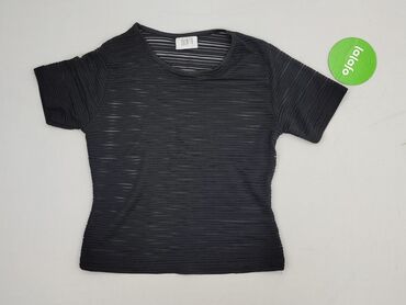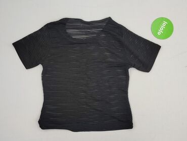 Czarna, transparentna bluzka z siatki/tulu z falbaną u dołu. - Krój: luźny, lekko oversize, z odcięciem w pasie i marszczoną falbaną tworzącą peplum. - Rękawy: krótkie, proste. - Dekolt: okrągły. ...