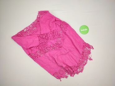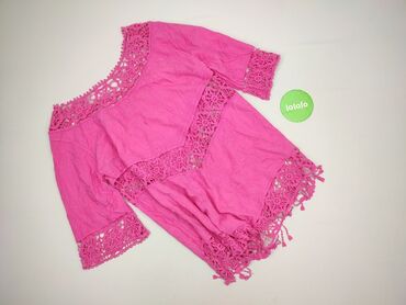 Bluzka damska w kolorze intensywnej fuksji. - Fason: luźny, z opadającym rękawkiem (nietoperz/dolman). - Dekolt: w kształcie litery V z dekoracyjnymi, krzyżującymi się paseczkami. - Ozdoby: delika...