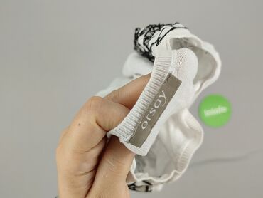 Bluzka Orsay, biała, prążkowana. - Krój: dopasowany, dekolt w serek z przodu, ozdobne wycięcie w kształcie rombu na plecach. - Rękawy: krótkie, lekko bufiaste; na każdym rękawie rząd ozdobnych guz...
