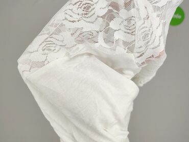 Biała damska koszula z krótkim rękawem, zapinana na guziki. - Fason prosty, lekko luźny, z niewielkimi rozporkami po bokach u dołu. - Ozdobny kołnierzyk z ażurowym, koronkowym wycięciem w kształc...