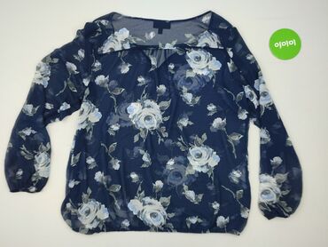 Bluzka damska Malecka, rozmiar 42. - Kolor: granatowy w drobny, biało-różowo-niebieski kwiatowy print. - Fason: luźny, z możliwością ściągnięcia po bokach – długie troczki po obu stronach pozwalają...