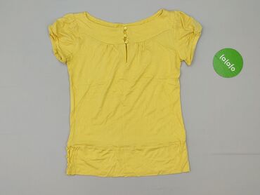 Żółta bluzka damska z krótkim rękawem - Krój: luźny, z lekkim wcięciem w talii i dekoracyjnym wiązaniem z przodu, dół lekko falowany/peplum - Dekolt: łódkowy - Rękawy: krótkie - Materiał: cienka, ...