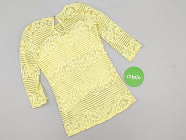 Bluzka damska w kolorze pastelowo‑żółtym. - Krój: lekko taliowany, długość do bioder - Dekolt: półokrągły z dekoracyjną, ażurową koronką/aplikacją z pętelkowym wzorem - Rękawy: krótkie, z delikatn...Stan: