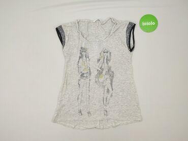 Bluzka damska Promod z krótkim rękawem. - Krój: prosty, lekko taliowany; dekolt okrągły - Materiał: przód i rękawy z lekkiej, zwiewnej tkaniny; tył z miękkiej, elastycznej dzianiny - Wzór: musztar...