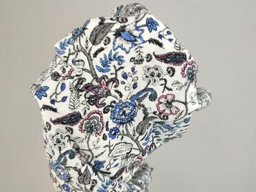 - Wzór: gęsty, kwiatowy nadruk w odcieniach niebieskiego, szarości i burgundu na białym tle