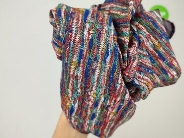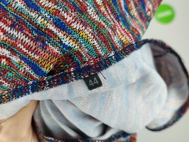 Bluzka damska dzianinowa z ażurowym wzorem chevron - Krój: luźny, prosty, z krótkim rękawem - Dekolt: w serek, obszyty lamówką - Wzór: pasy/zygzak (chevron) w odcieniach bieli, beżu, błękitu i tur...