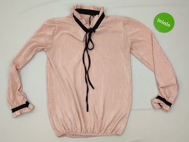 Bluzka damska Modus, rozmiar S - Fason z długim rękawem i wysoką stójką. - Kolor pudrowy róż z czarnymi wstawkami. - Dekoracyjna, duża falbana z czarnej satyny biegnąca pionowo przez przód. - Górn...