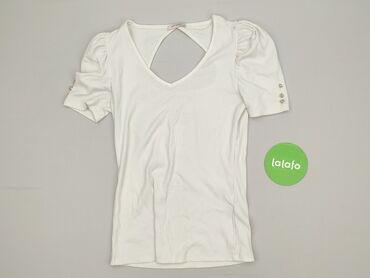 Bluzka damska Orsay - Kolor: biały - Krój: prosty, lekko luźny - Dekolt: w kształcie litery V z delikatną, srebrzystą lamówką - Rękawy: krótkie - Dół: zaokrąglony, nieco dłuższy z tyłu - Materiał:...