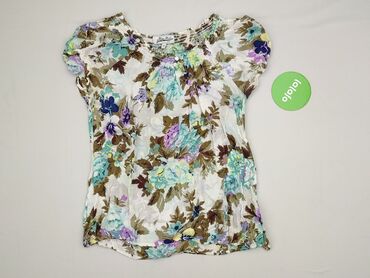 Bluzka damska O&S Paris, rozmiar M - Krótki rękaw - Zwiewna, cienka tkanina - Wzór paisley na jasnym tle w odcieniach turkusu, fioletu i zieleni - Dekolt w serek z delikatną falbaną i listwą guziko...