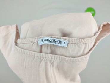 Bluzka damska JANINA, rozmiar S - Krój: luźny, z lekko obniżoną linią ramion; dekolt w kształcie litery V - Zapięcie: rząd różowych guzików z przodu - Dół: marszczona gumka, dzięki czemu bluzka ła...