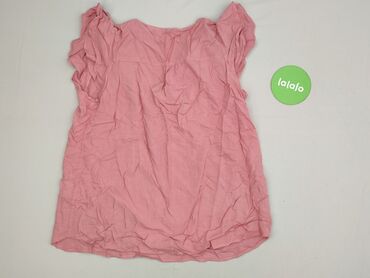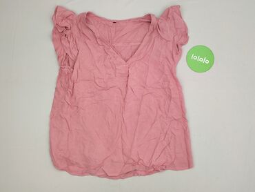 Różowa bluzka damska z krótkim rękawem - Kolor: pudrowy róż - Fason: luźny, prosty; okrągły dekolt z małym rozcięciem/łezką z tyłu - Rękawy: krótkie, lekko opuszczone - Materiał (z metki): 96% wis...