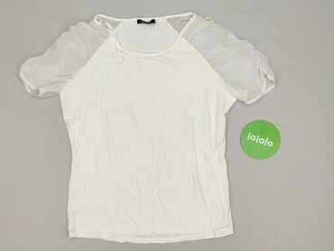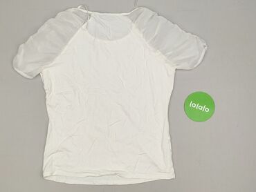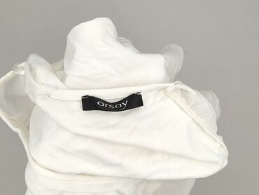 Bluzka damska Orsay, biała, krótki rękaw. - Fason: luźny, z marszczeniami przy dekolcie; dół zakończony gumką lekko ściągającą. - Dekolt: łódka. - Przód: lekko transparentny, delikatnie lejący mat...