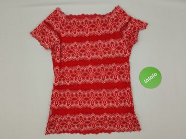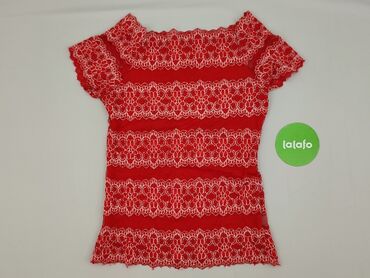 Czerwona bluzka koronkowa z długim rękawem i ozdobnym kołnierzykiem. - Fason: dopasowany, długość do bioder - Materiał: elastyczna koronka z kwiatowym wzorem; pod spodem miękka, gładka podszewka/t...Stan: