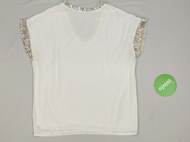 Biała damska bluzka z lekkiej, półprzezroczystej tkaniny - Fason: kopertowy/przód na zakładkę, swobodnie opadający, z delikatnie marszczonymi ramionami - Krój lekko luźny, miękko układający się na...Stan: