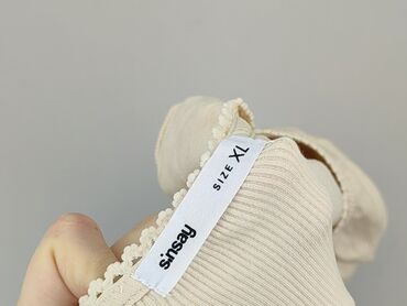 Bluzka bez rękawów damska, rozmiar XL. - Krój: prosty, bez rękawów, okrągły dekolt - Wzór: kwiatowy na kremowym tle; delikatnie tłoczona/koronkowa faktura tkaniny - Kolory: beż, brąz, złamany biał...