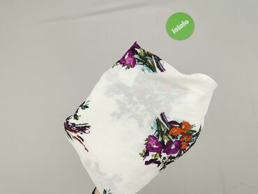 - Wzór: białe tło z kwiatowymi bukietami w odcieniach fioletu, pomarańczu i zieleni
