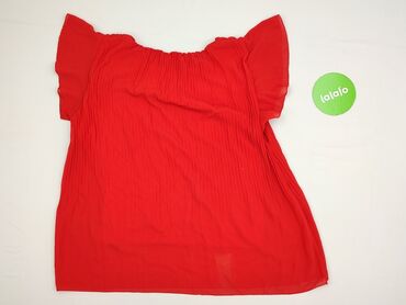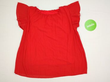 Czerwona bluzka damska z krótkim rękawem - Fason: luźny, z dekoltem w kształcie litery V - Zapięcie: krótna listwa z trzema guzikami z przodu - Rękawy: krótkie, z patką i guzikiem do podpięcia - K...