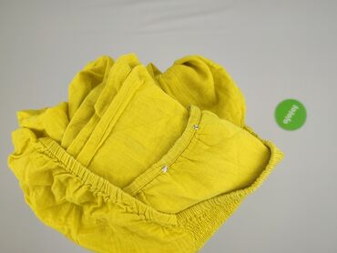 Bluzka damska z krótkim rękawem, pastelowo‑żółta - Fason: luźny, pudełkowy krój; opuszczona linia ramion; kołnierzyk z klapami - Zapięcie: na guziki z przodu - Rękawy: krótkie, szerokie, wywijane ...Stan: