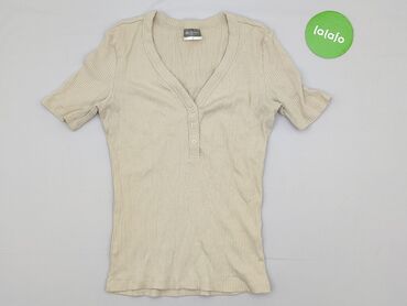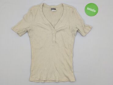 Ta beżowa bluzka damska z krótkim rękawem charakteryzuje się luźnym krojem i marszczeniami po bokach, regulowanymi za pomocą troczków. Dekolt jest zaokrąglony. Bluzka wykonana jest z prążkowanej dz...Stan: