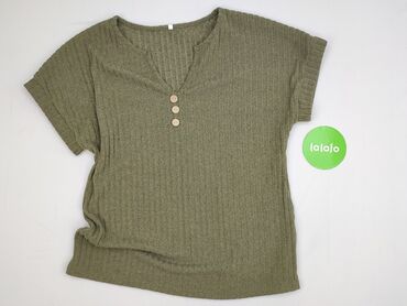 Bluzka damska w kolorze khaki/oliwkowym - Krój: luźny, z obniżoną linią ramion i krótkim rękawem - Dekolt: w serek z krótką listwą guzikową (plisa bez widocznych guzików) - Dół: lekko zaokrąglony ...