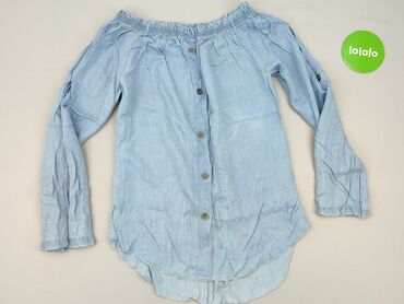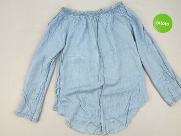 Bluzka damska hiszpanka, denimowy odcień niebieskiego - Krój: odsłaniane ramiona (hiszpanka) z elastyczną gumką przy dekolcie - Rękawy: 3/4 z wiązaniami przy mankietach - Zapięcie: rząd guzików z ...