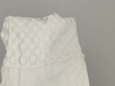 Biała damska koszula z krótkim rękawem, zapinana na guziki. - Fason prosty, lekko luźny, z niewielkimi rozporkami po bokach u dołu. - Ozdobny kołnierzyk z ażurowym, koronkowym wycięciem w kształc...