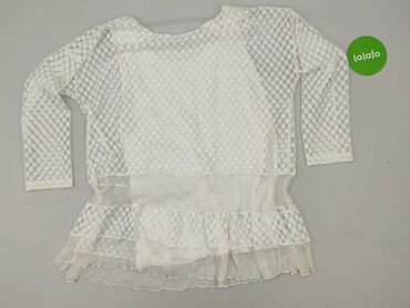 Bluzka damska z długim rękawem, biała. - Krój prosty, luźniejszy, z okrągłym dekoltem. - Materiał lekki, półprzezroczysty, z delikatną fakturą w poziome, nieregularne prążki/drapowania. - Rękawy...